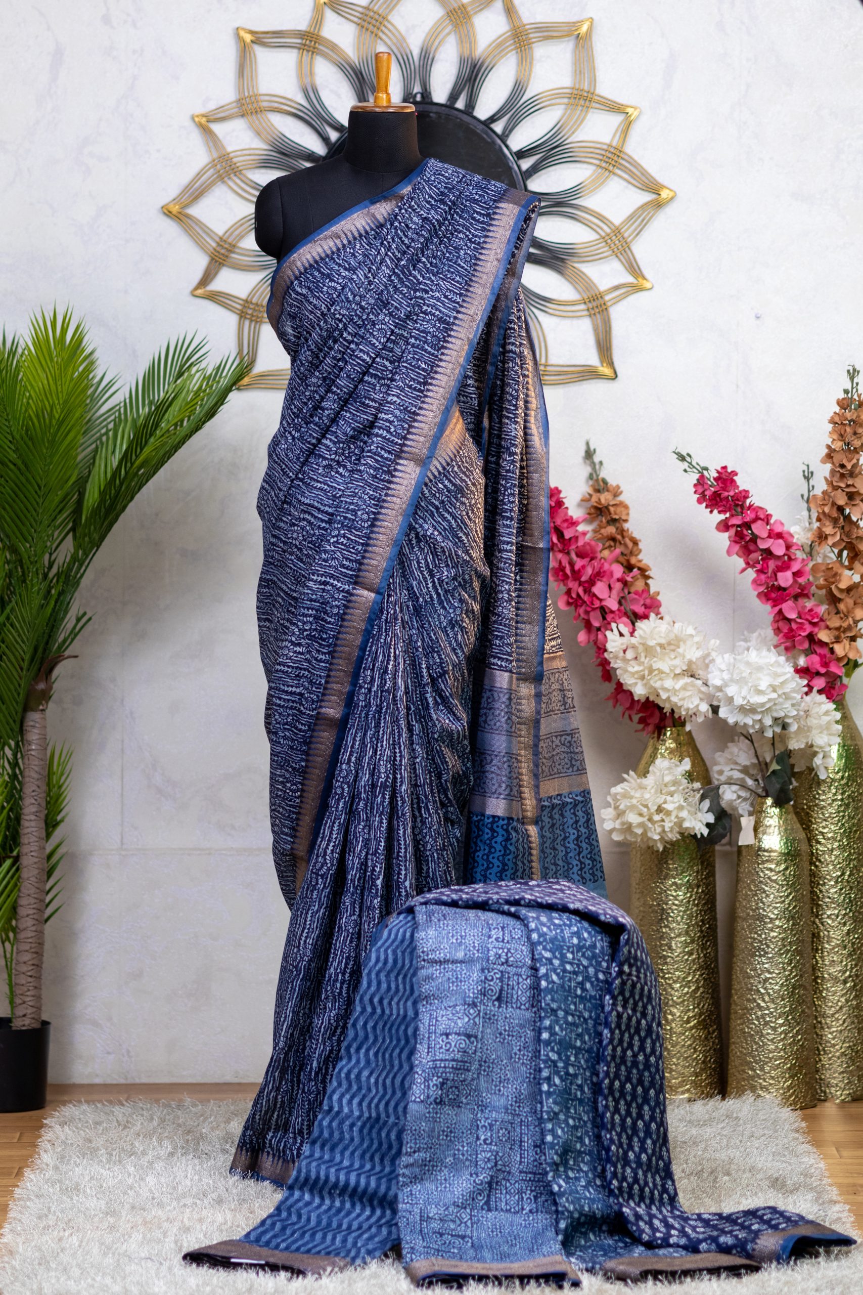 Design: Allover indigo print with vertical and horizontal pattern play; finished with an ornate Banarasi border for a heritage touch