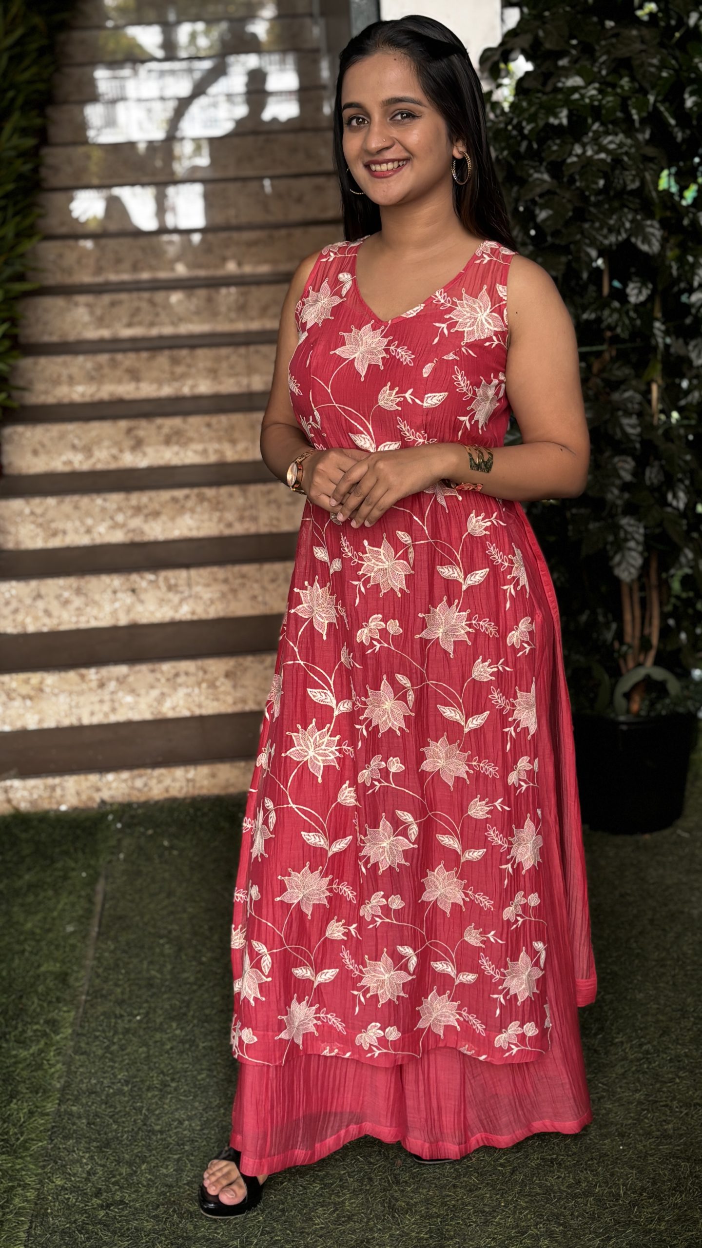 Bold and elegant, this medium fuchsia ensemble features a straight-cut sleeveless top with a daring high slit and delicate white floral creeper embroidery. Paired with a plain 3-panel flared palazzo, it’s tailored to flatter Top & Bottom Oval body shapes with a breezy, confident silhouette.