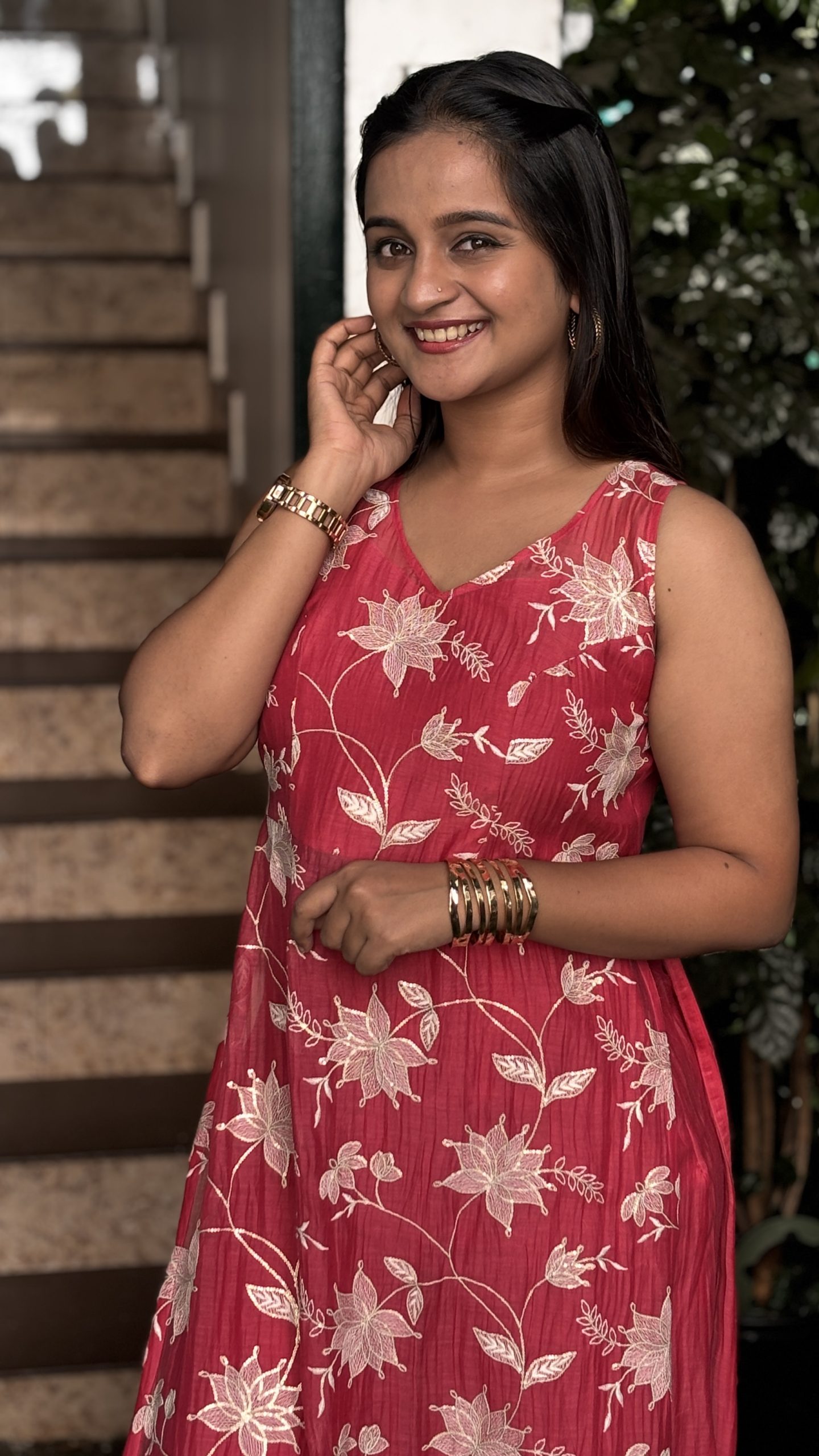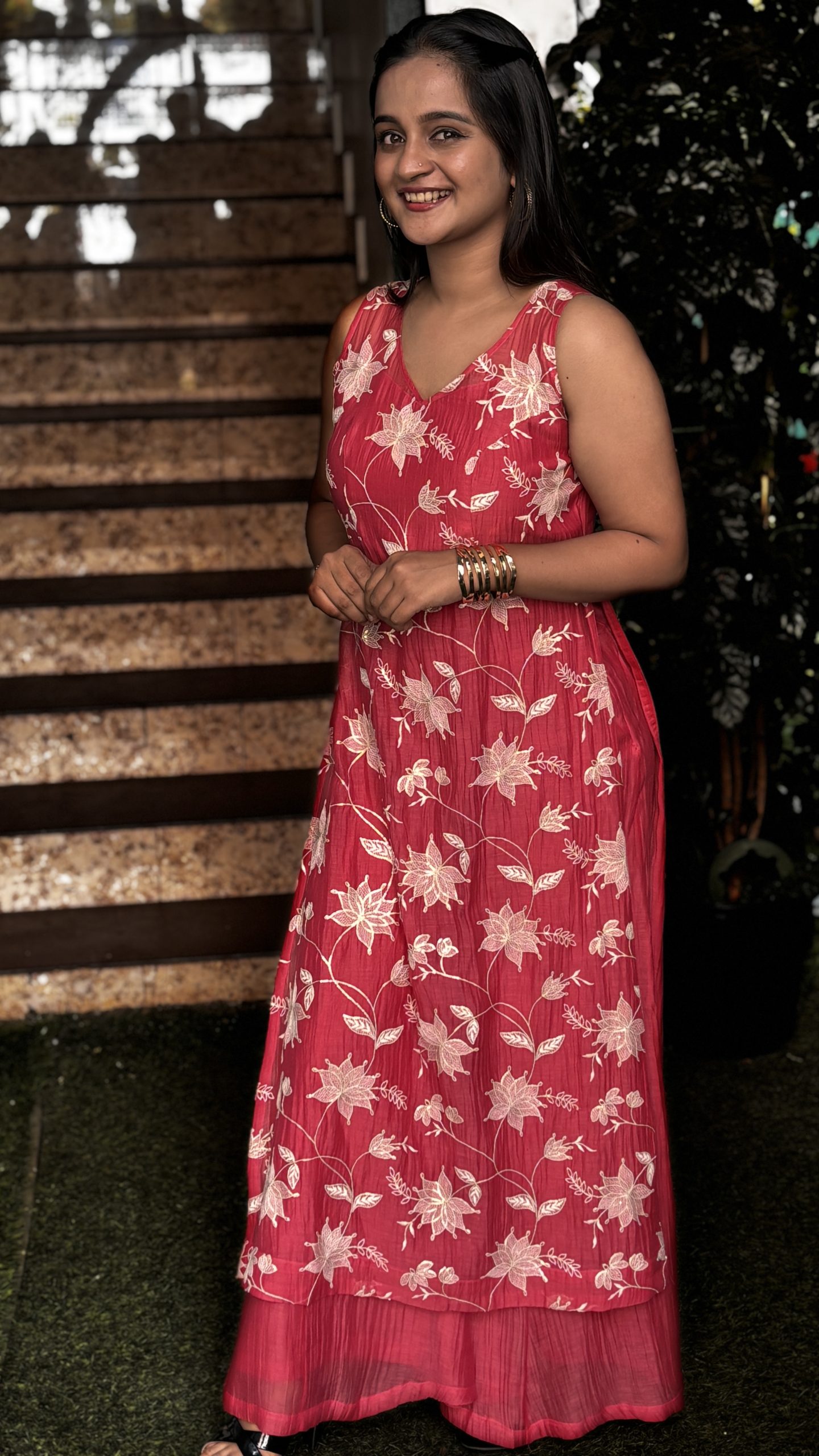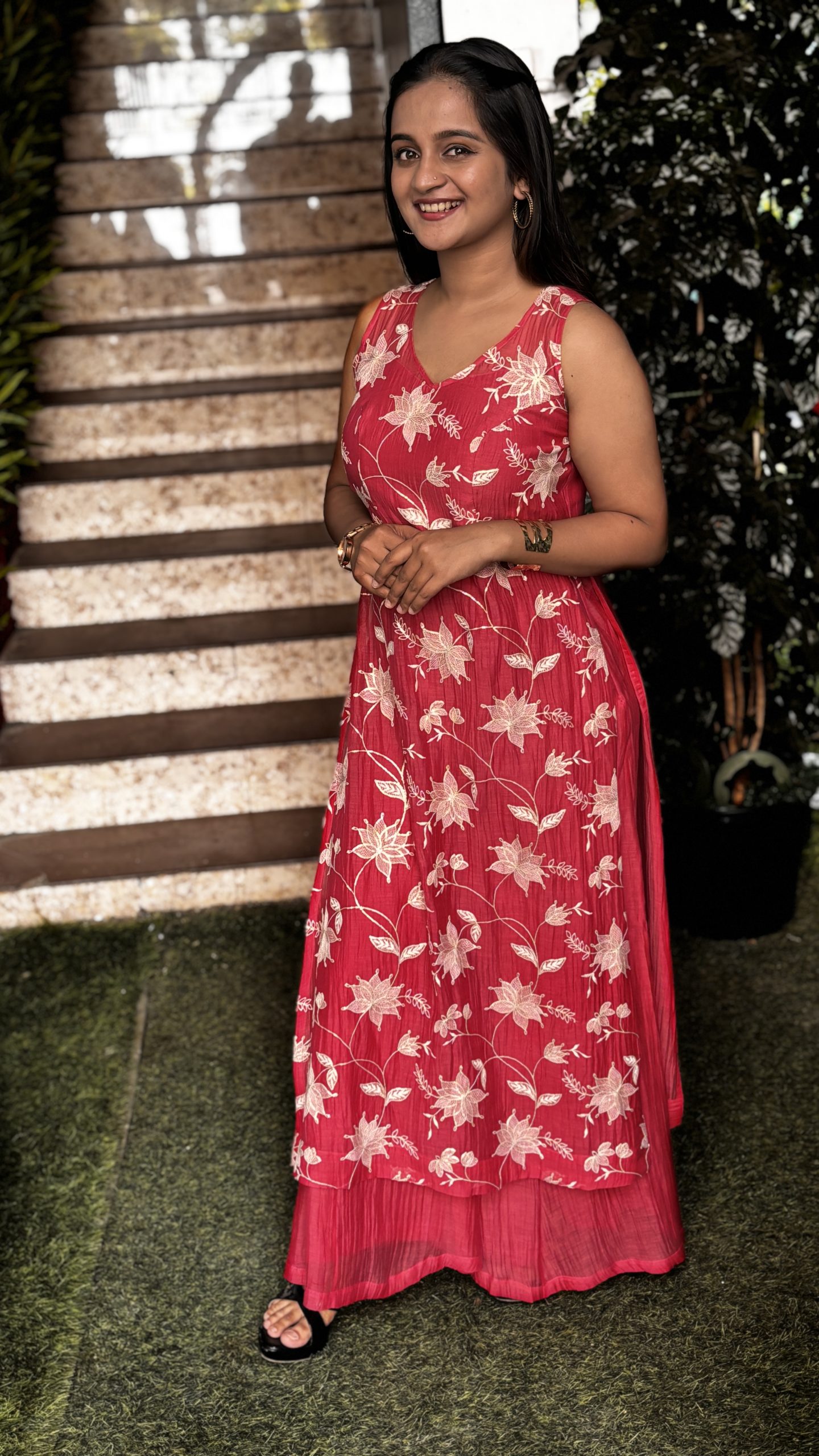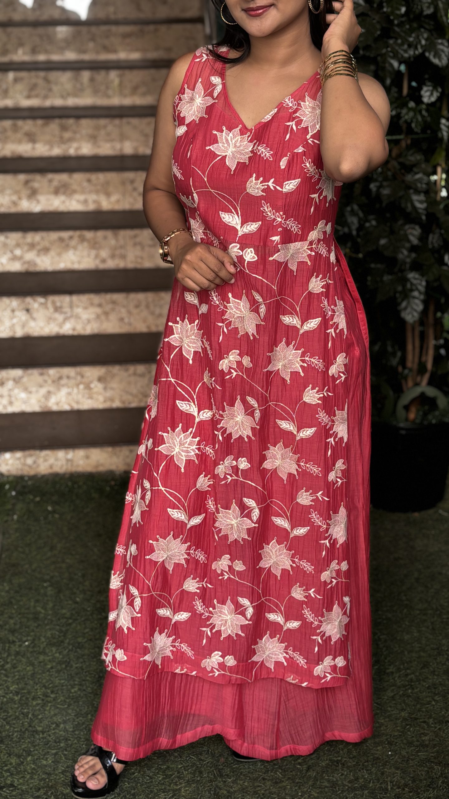 • Embroidery: Intricate white floral creeper embroidery cascades across the bodice, adding elegance and artisanal charm.