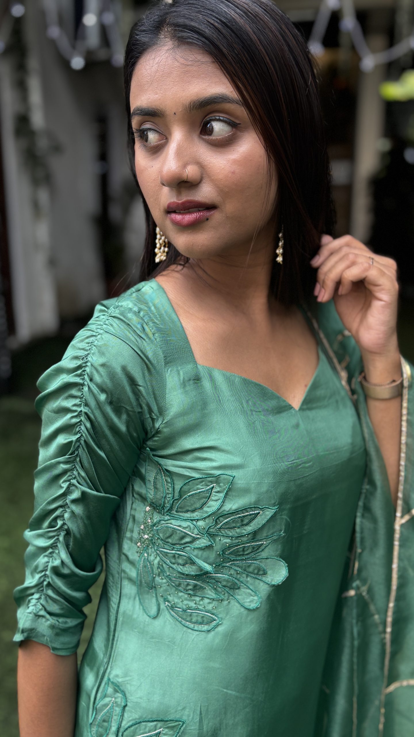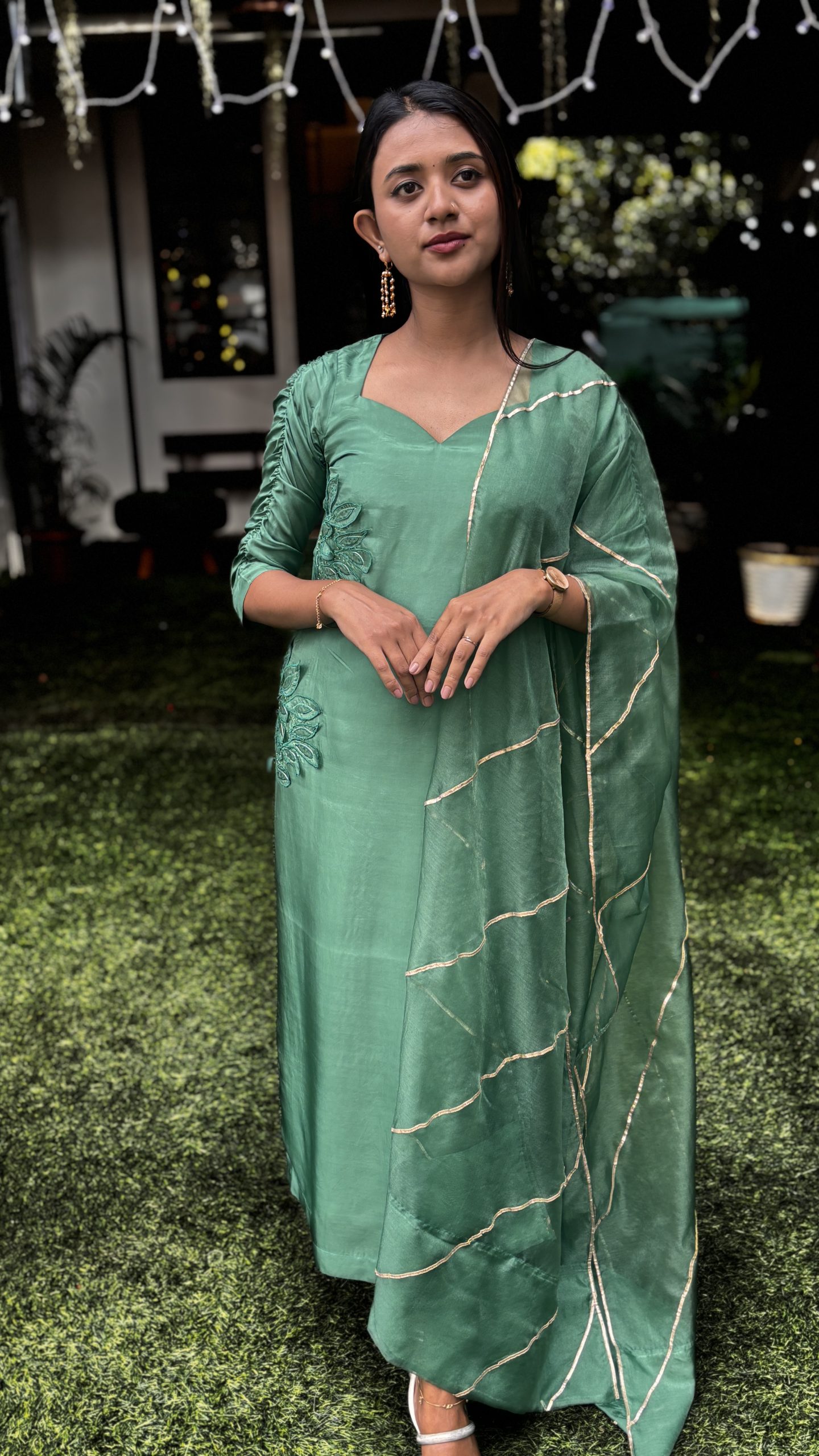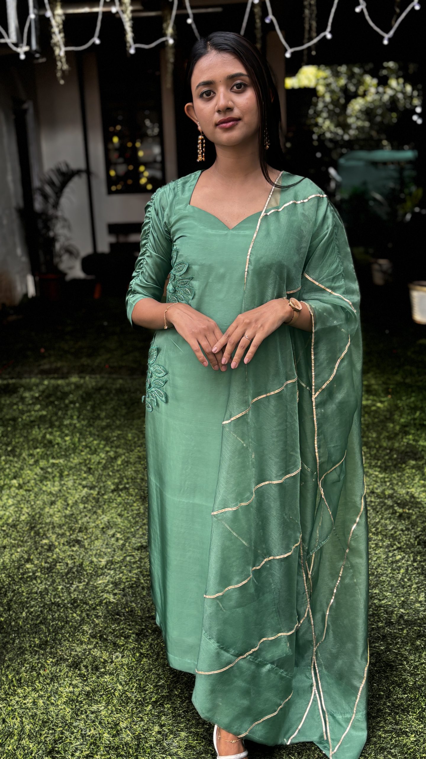 • Intricate self-colored appliqué work and delicate hand embroidery on the bodice and sleeves