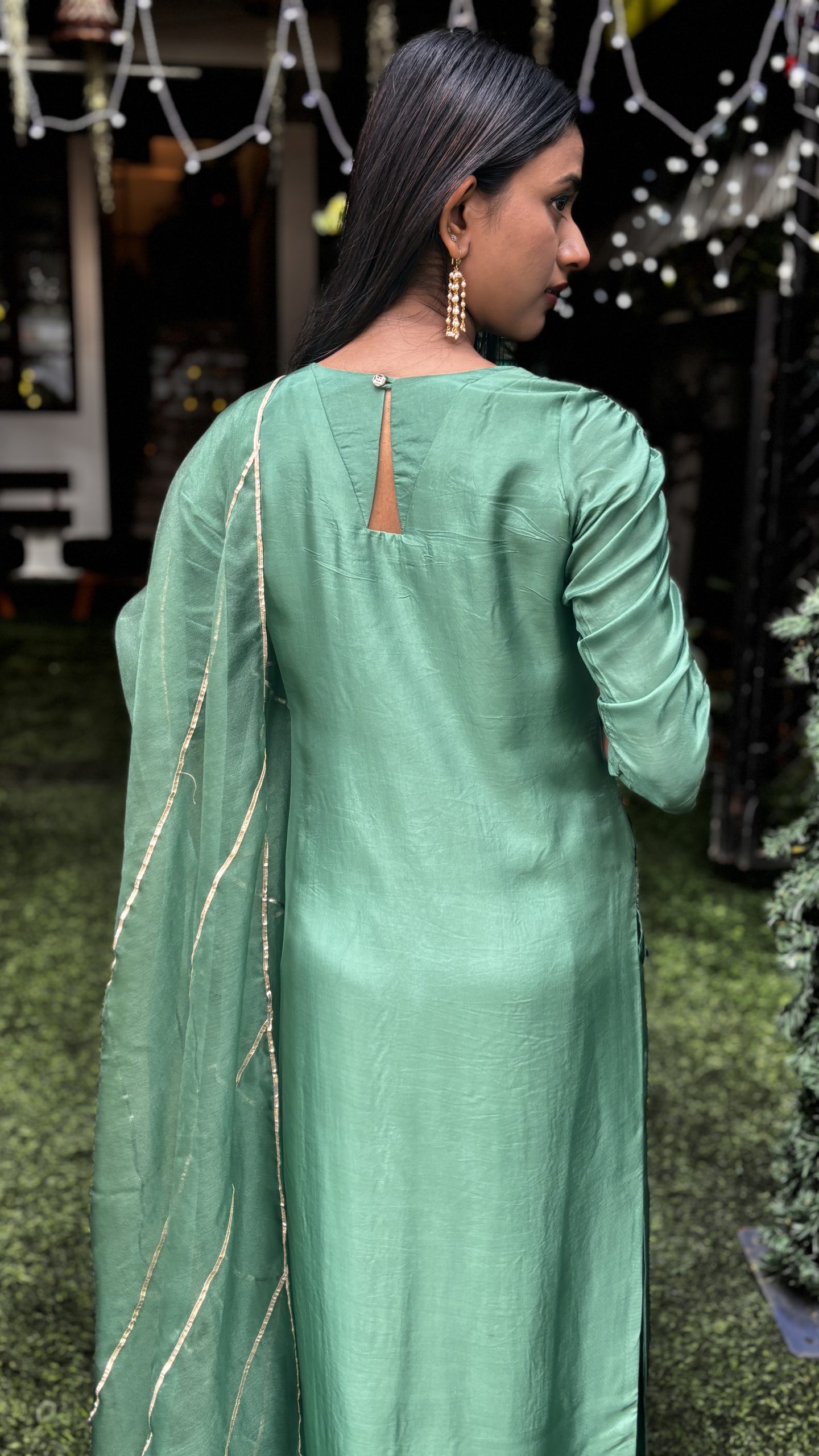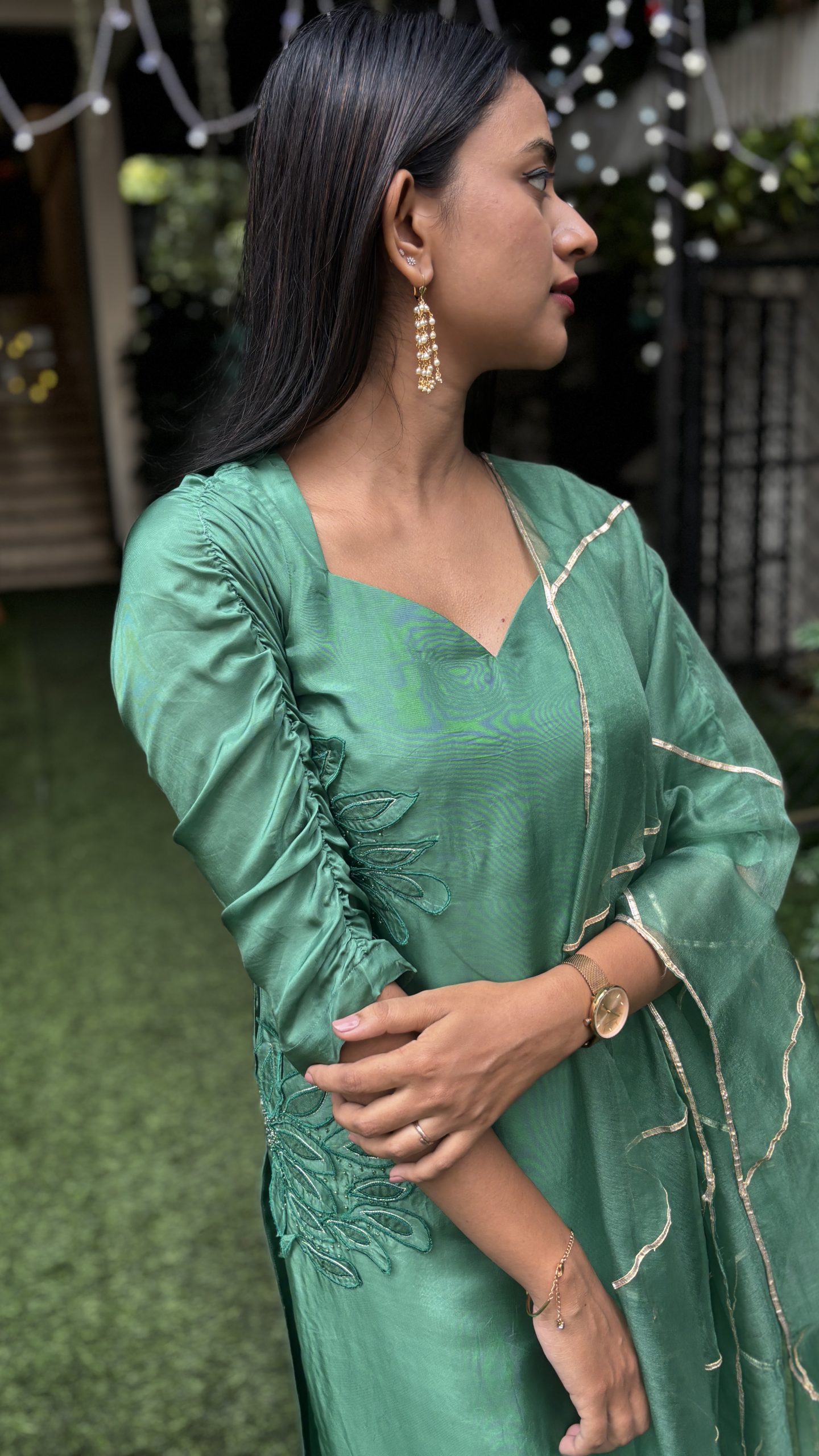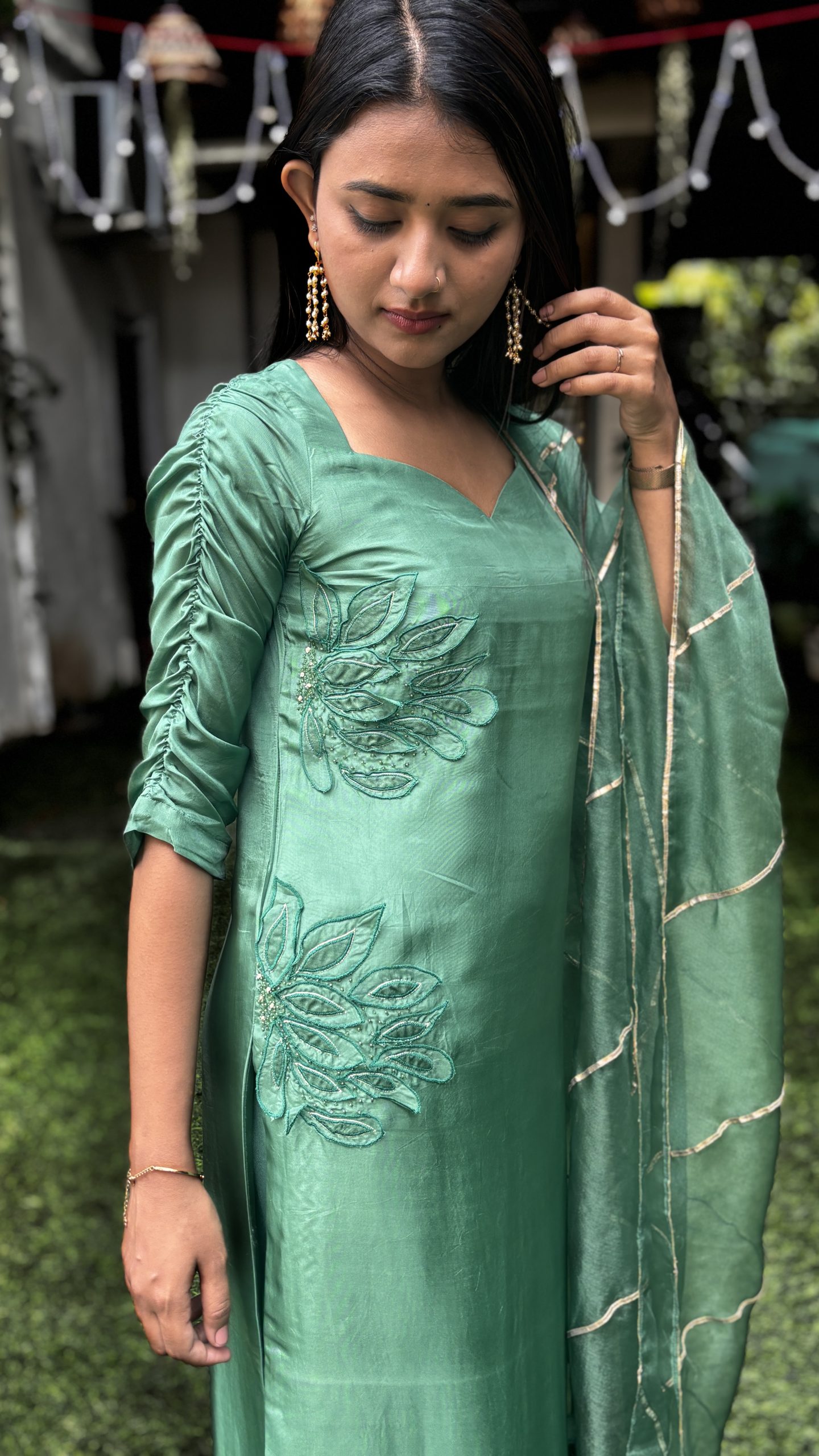 • Intricate self-colored appliqué work and delicate hand embroidery on the bodice and sleeves