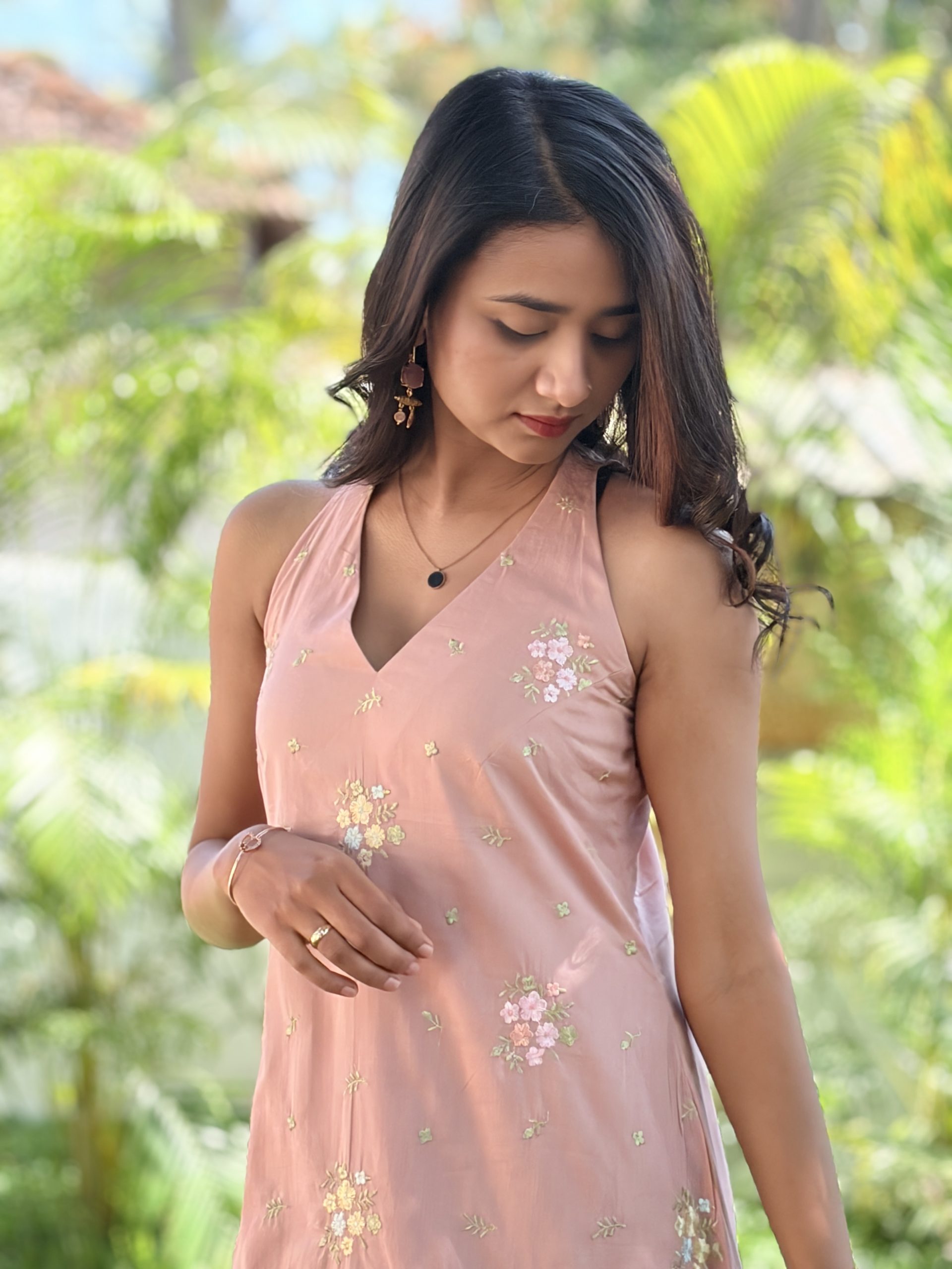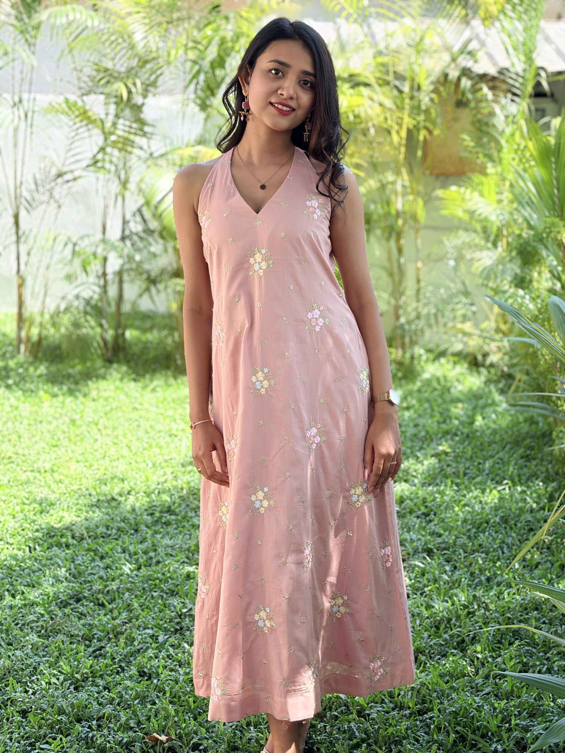 Step into understated charm with this A‑line halter V‑neck dress, designed using ultra‑soft mul cotton fabric. The front panel features delicate multi‑colour small floral embroidery, adding a handcrafted touch, while the back is kept minimal with smooth plain fabric for a clean, graceful silhouette. A subtle keyhole opening at the back enhances both comfort and style, making this dress perfect for brunch outings, vacations, casual evenings, and warm‑weather days.