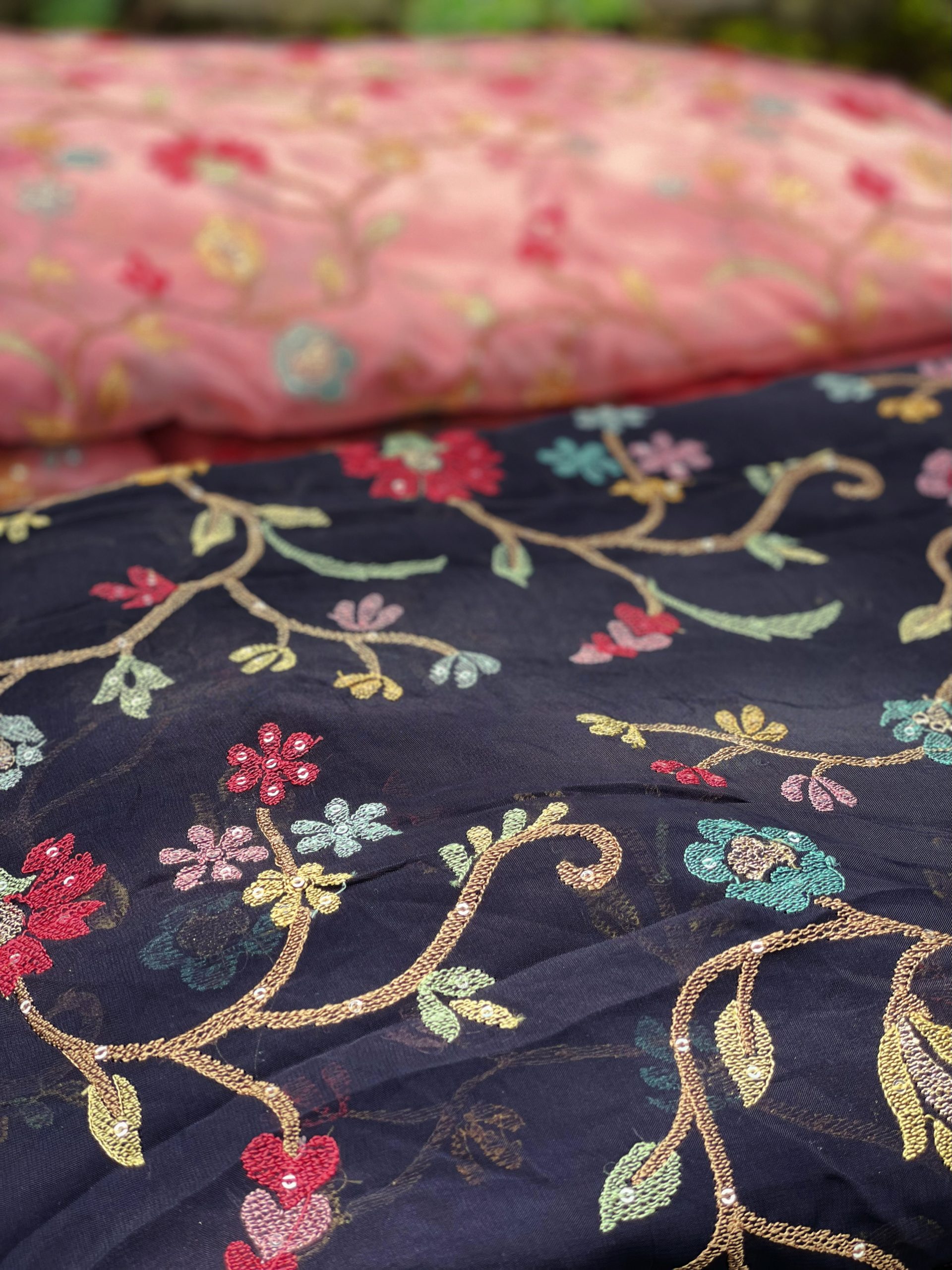 Design: Allover floral embroidery in vibrant threadwork with shimmering sequins for added glamour