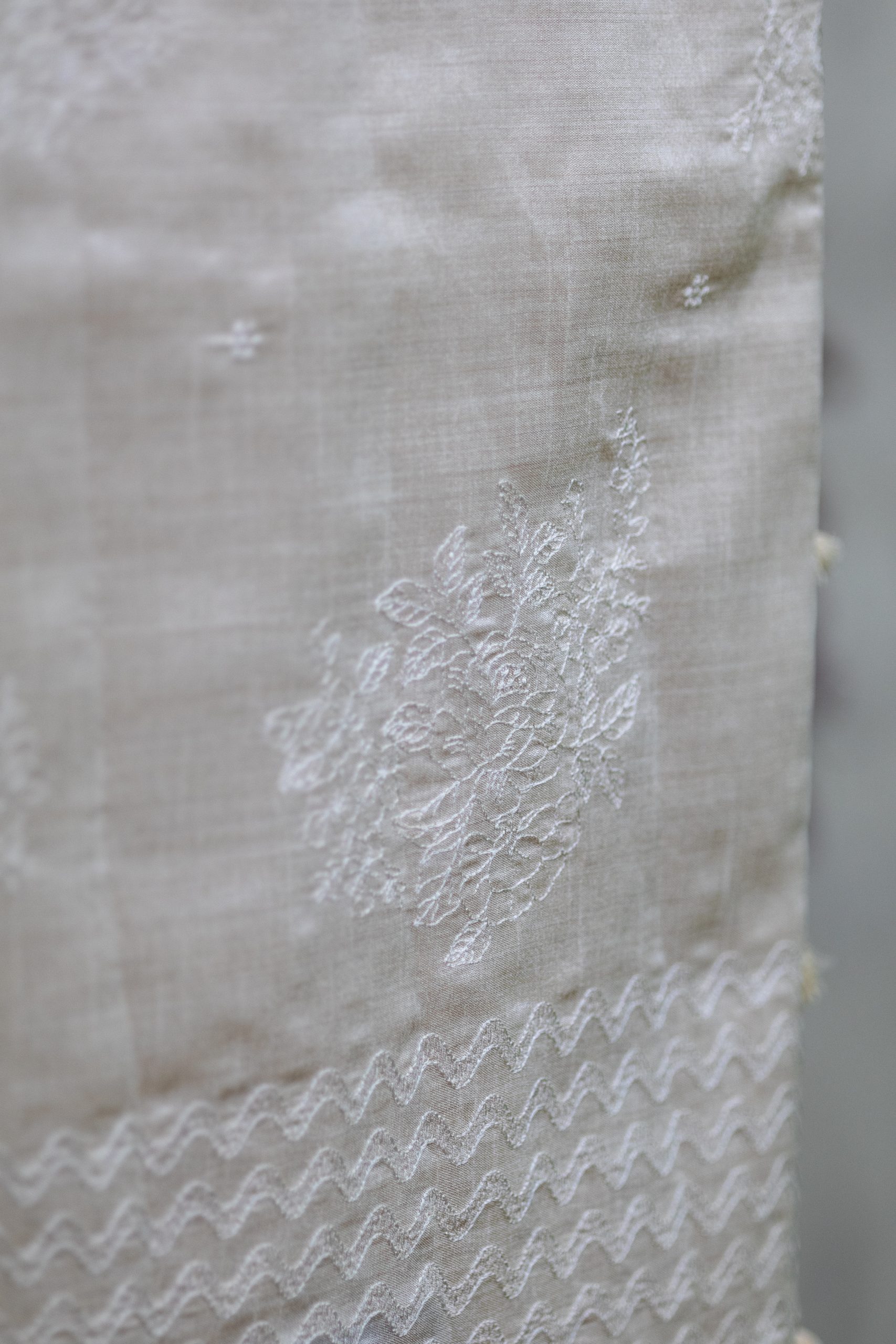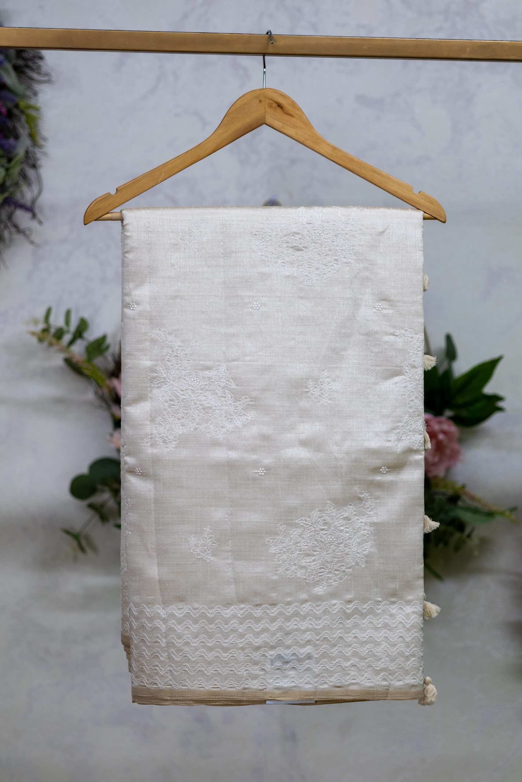 Design: Allover floral and geometric embroidery with a decorative border and tassel accents for added flair