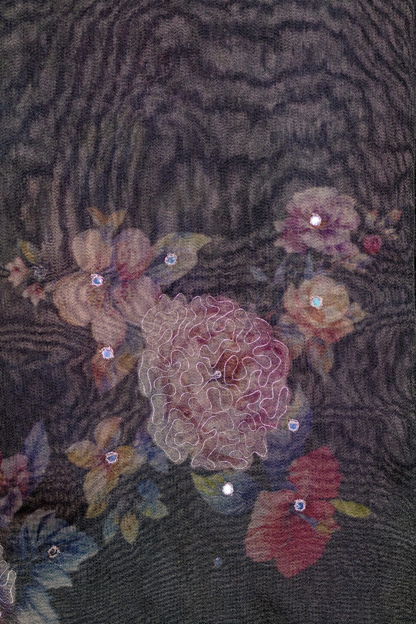 • Design: Digital floral print enhanced with hand-embroidered embellishments; scalloped edges for added charm